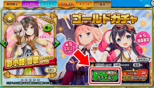 ゴールドガチャって 現在ゴールドガチャがありますが、皆さんは回しますか? 回すとしたら何故ですか? 回さない方は何が出れば回しますか? 私は「タスが欲しければ神殿を回ればいいじゃない! 」 と考え、「ケンチーが欲しければ超爆絶回ればブロンズガチャは無料ガチャもあるが、リセマラではシルバーガチャを活用しよう。 ゴールド単発ガチャは600ゴールド、10連ガチャは初回のみ3000ゴールドが必要となる。 なお、シルバーガチャ10連は初回のみ300ゴールドとなっている。 当たりが出るまで※1回限定★5確定無料10連ガチャ 10/2(土) 2359まで (カッパ猫のバッジexスキル潤いが大事にゃ:プレイヤー経験値225倍、獲得ゴールド25倍) 1回 ☆50と、10回 ☆500 (★4以上1人確定)で引く
